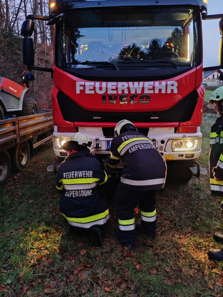 Heute Nachmittag wurden wir zu einer Baggerbergung in Empersdorf alarmiert. Der Bagger hatte sich im schlammigen Gelände festgefahren.